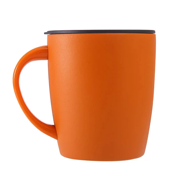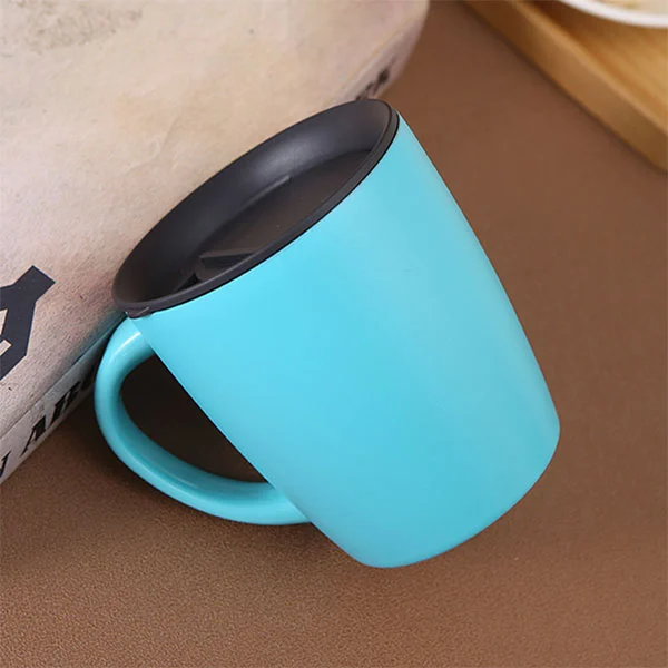 Ovo je krigla od nehrđajućeg čelika od nehrđajućeg čelika sa poklopcem, zaobljenim izgledom, neka bude dobro raspoloženje, postavljene na stol, takođe je umetničko delo.